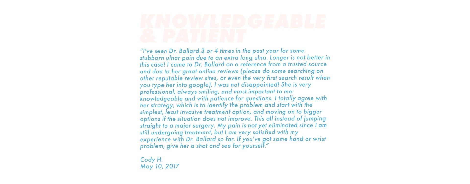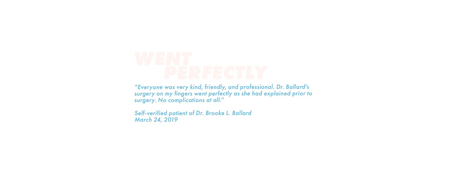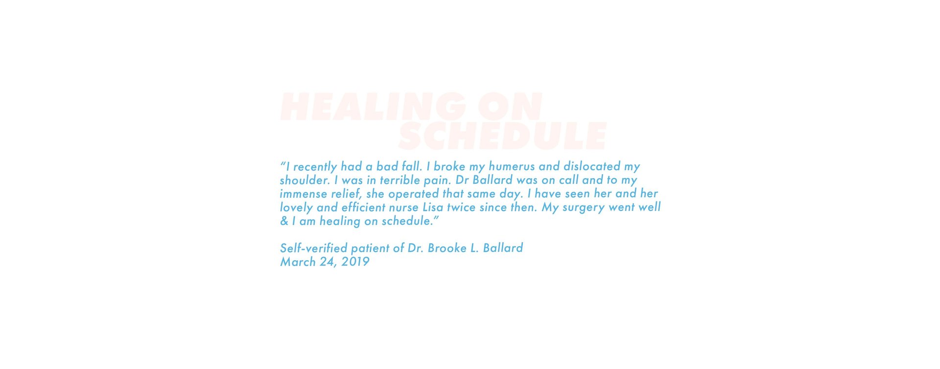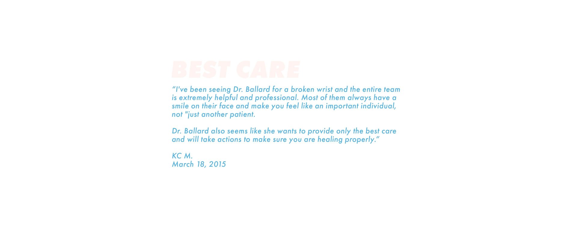 Dr. Ballard completed her general orthopedic residency at University of California at San Diego, then traveled to University of Florida for a fellowship focused on shoulder to fingertip orthopedic surgery. She received her M.D. from University of Illinois where she had previously graduated Magna Cum Laude with dual degrees in Honors Biology and Chemistry.